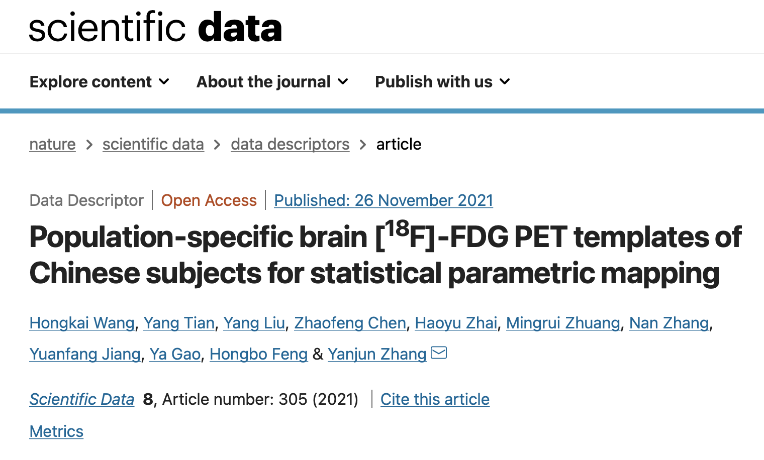 2021年11月,生物医学工程学院王洪凯教授团队研究成果“Population-specific brain [18F]-FDG PET templates of Chinese subjects for statistical parametric mapping”发表在Nature旗下期刊Scientific Data上(https://www.nature.com/articles/s41597-021-01089-1)。该研究基于脑部正电子发射断层成像(简称PET)的临床大数据,经过严格的数据筛选,采用机器学习算法生成中国人群的脑部PET影像平均图谱以及标准差图谱。